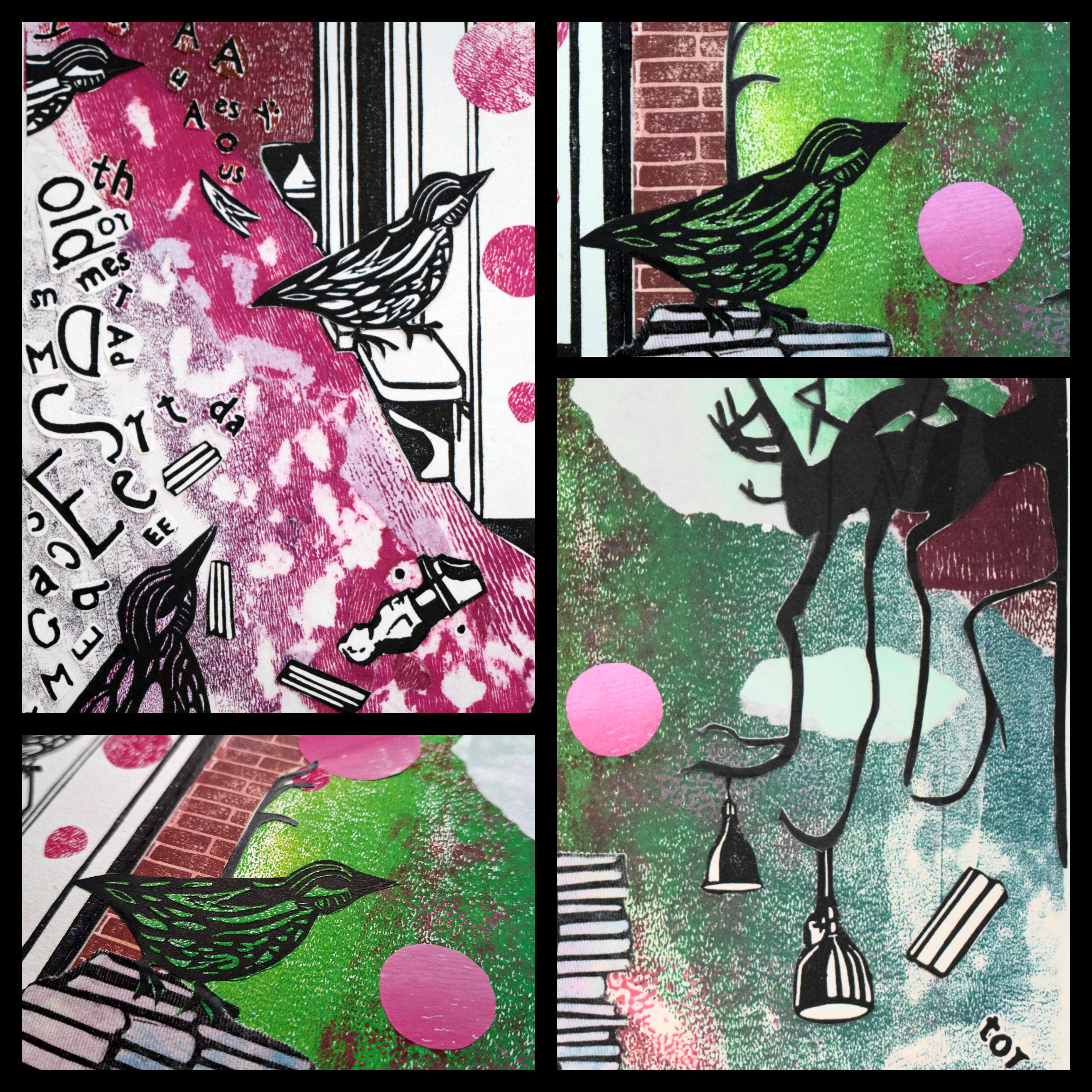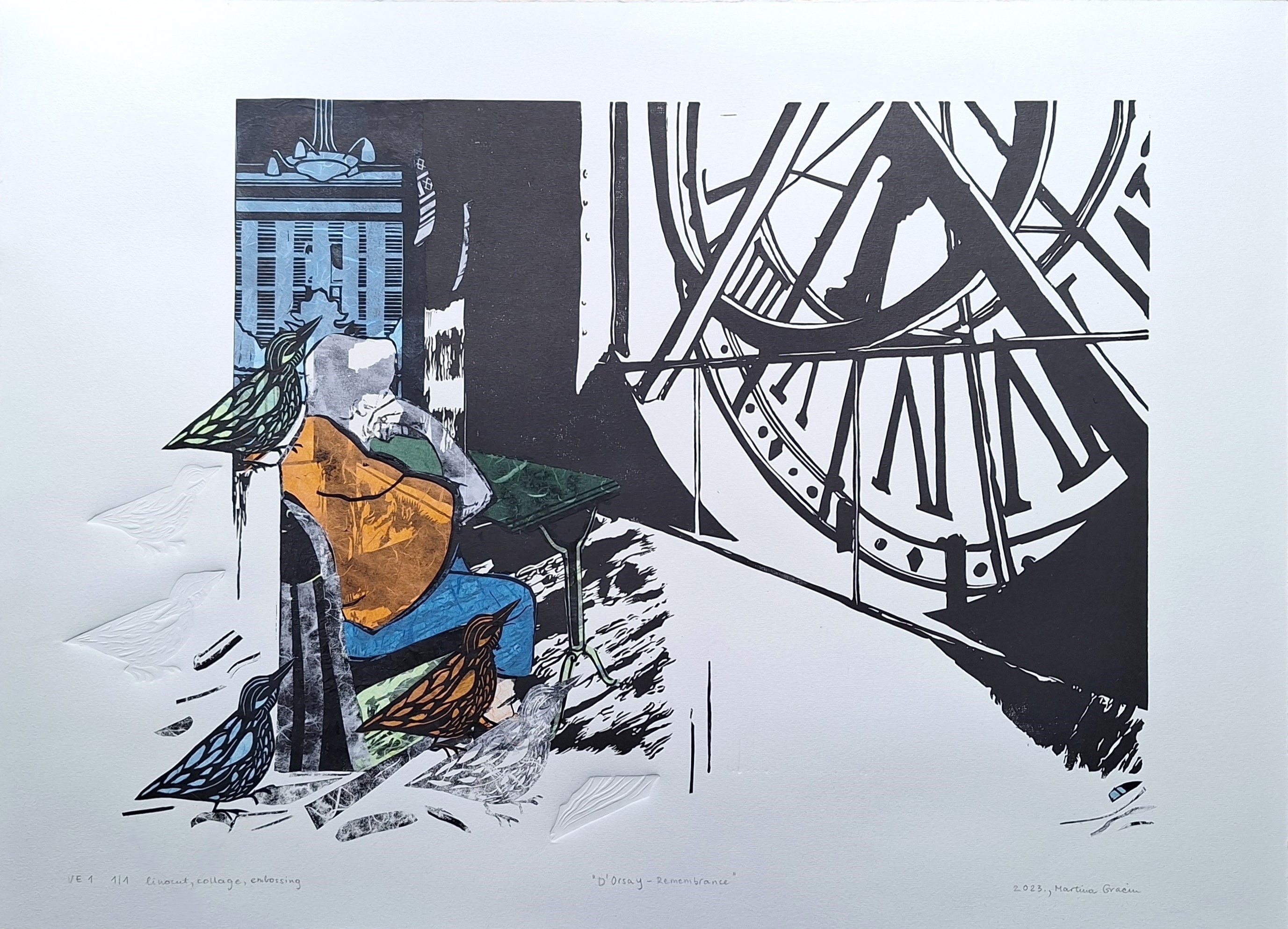 Ista se ptica pojavljuju i u radu D’Orsay- Remebrance. Načinjen je kolažem mojih ranijih linoreza D’Orsay i, ponovo, Le Pure café, a uz to sam na ovom radu upotrijebila i slijepi tisak. Bakica, koja je najprije sjedila u mom pariškom kafiću i gledala na ulicu, sad promatra ogromni sat i razmišlja o vremenu koje polako ističe. Ovaj sam rad radila nekako u vrijeme kad se zdravlje moje uvijek super-bake naglo počelo pogoršavati.