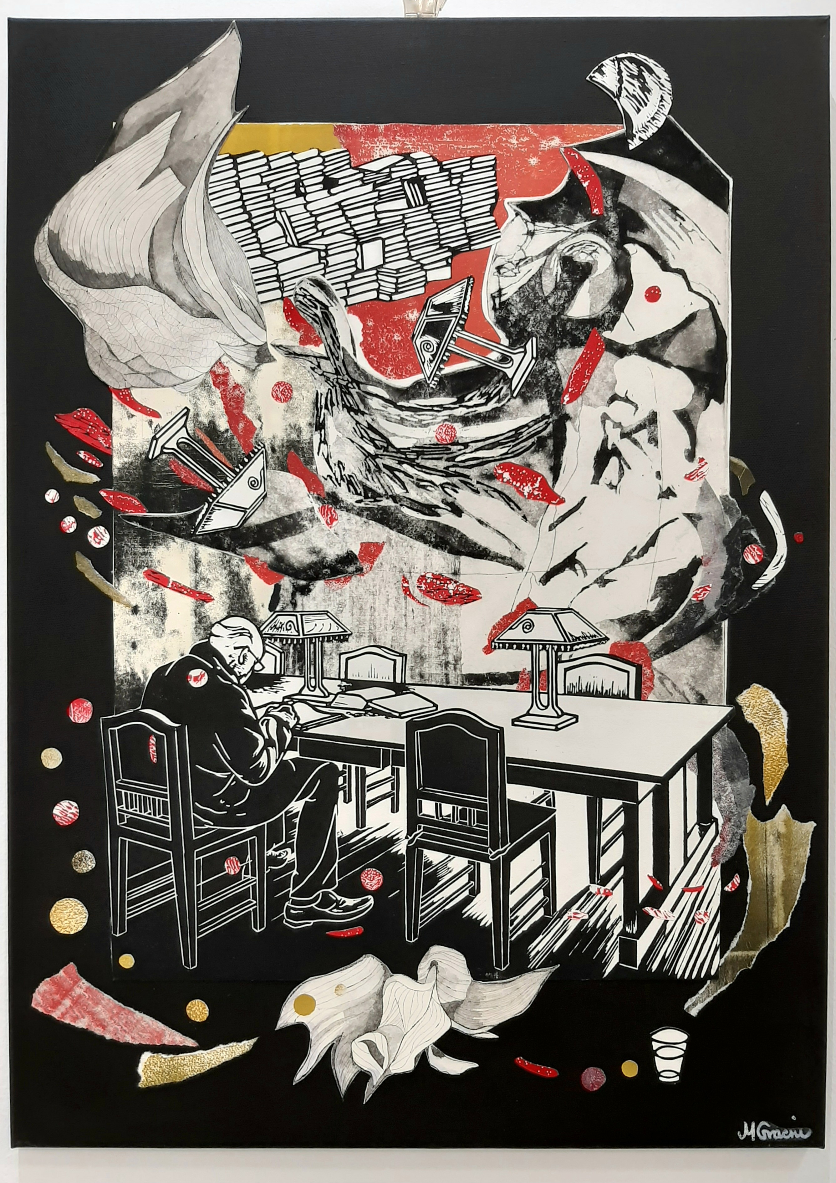 Isti se učenjak pojavljuje, ovaj put za svojim stolom, na radu Night reading. Ovaj je rad nešto većeg formata i također je napravljen na crnom slikarskom platnu. U njemu sam se već udaljila od Dalmacije i uputila u neke u sjevernije krajeve, baš kao i članovi moje obitelji prije nekoliko generacija. No, Night reading je još uvijek blizak okruženju u kojem sam odrasla, budući da su čitanje, proučavanje, učenjaštvo, ljubav prema knjizi i autoritetu znanja uvijek bili nešto što je članovima moje uže obitelji važno. Možda je djelomično i radi toga način na koji sam kao dijete doživljavala istraživanje nepoznatog u knjigama i u vlastitoj mašti postao jedan od motiva koji u mojim očima i danas zamućuje granicu između stvarnog i nestvarnog, između sna i jave. Tehnički, osim linoreza i monotipije, u ovom su radu i elementi bakropisa i akvatinte.