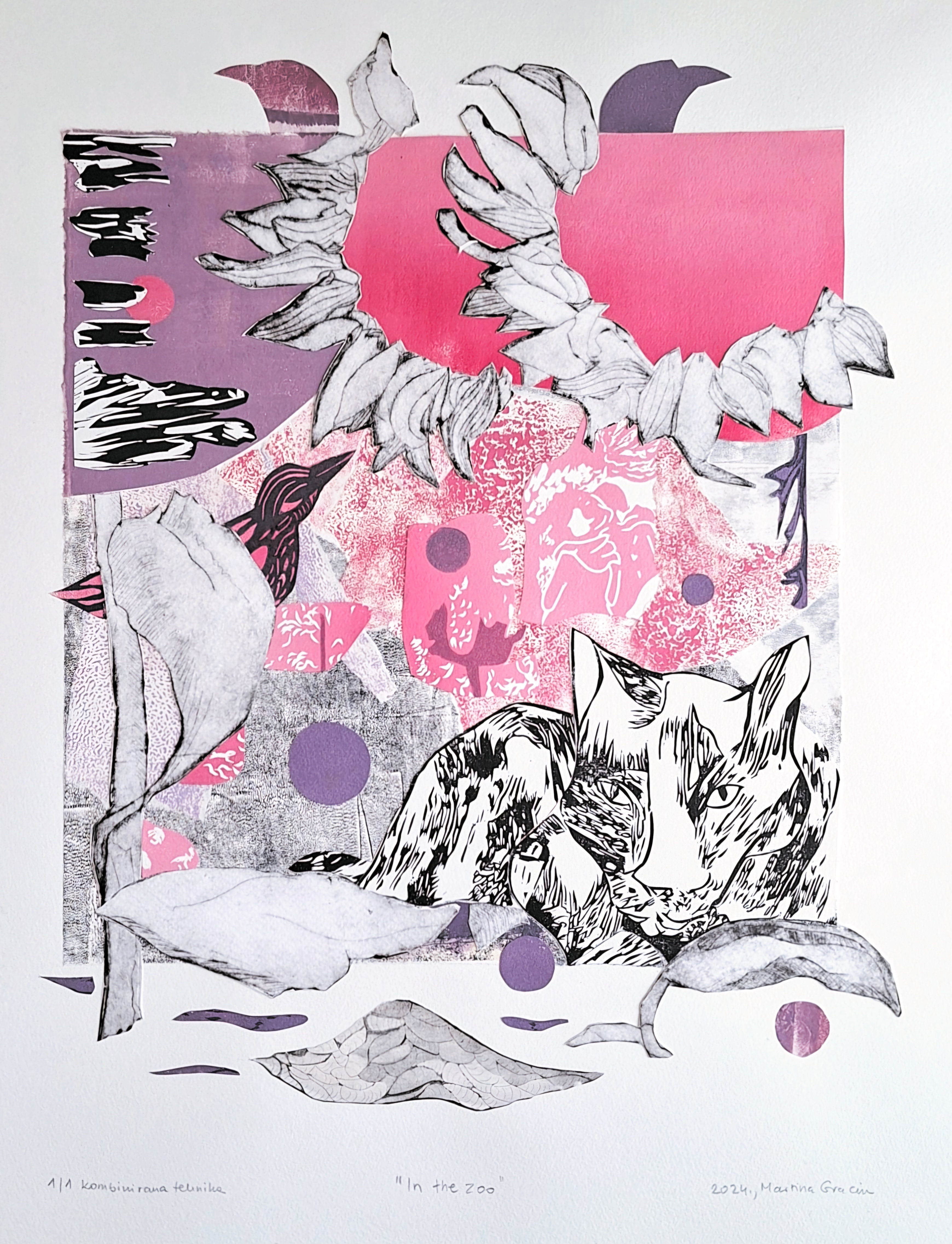 Još jedna od karakteristika moje uže obitelji je vječna okruženost biljkama i životinjama. Kao model za mačka na lijevom radu (In the zoo) poslužio je onaj bakin s linoreza Mačkopis (za više o tom radu kliknite ovdje). Mladi par koji se pojavljuje na sva tri rada je ponovo sa Stare sveučilišne, a ptica na lijevom s jednog linoreza kojeg sam izdubila u vrijeme dok sam još studirala na Akademiji.