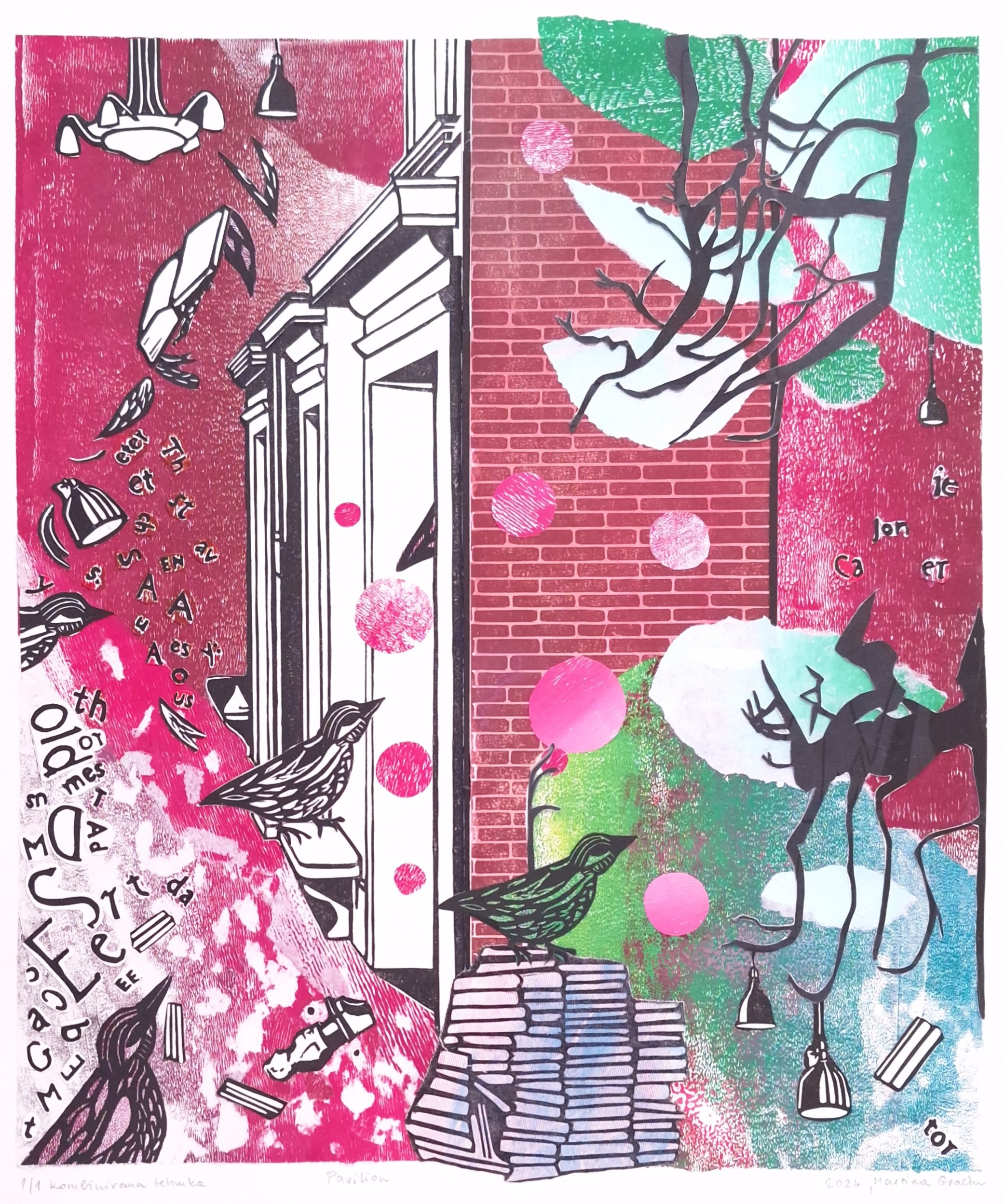 Na sljedećem su radu, Pavilion, ptice okružene letećim knjigama i padajućim slovima. Ulazeći u cigleni paviljon, u njemu nalaze sigurnost i zaštitu. Cigleni zid sam preuzela sa svog linoreza Toulouse, a zidove paviljona u perspektivnom skraćenju s linoreza Ca’ Rezzonico. Knjige na kojima se nalazi ptica u prvom planu otisnute su na tekstilu, nebo i krošnje su napravljeni od monotipija, dok sam stablo preuzela sa mog linoreza Blois.