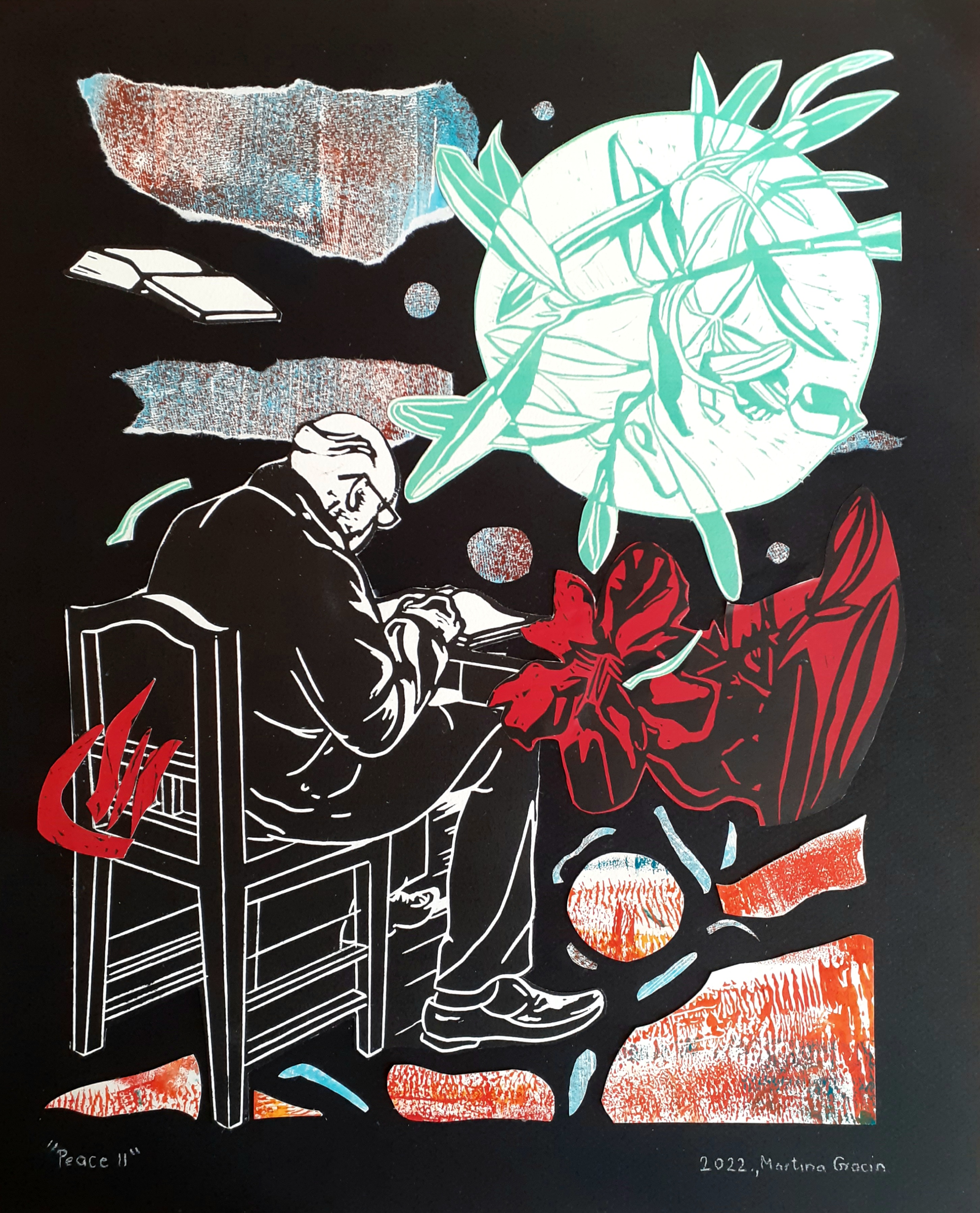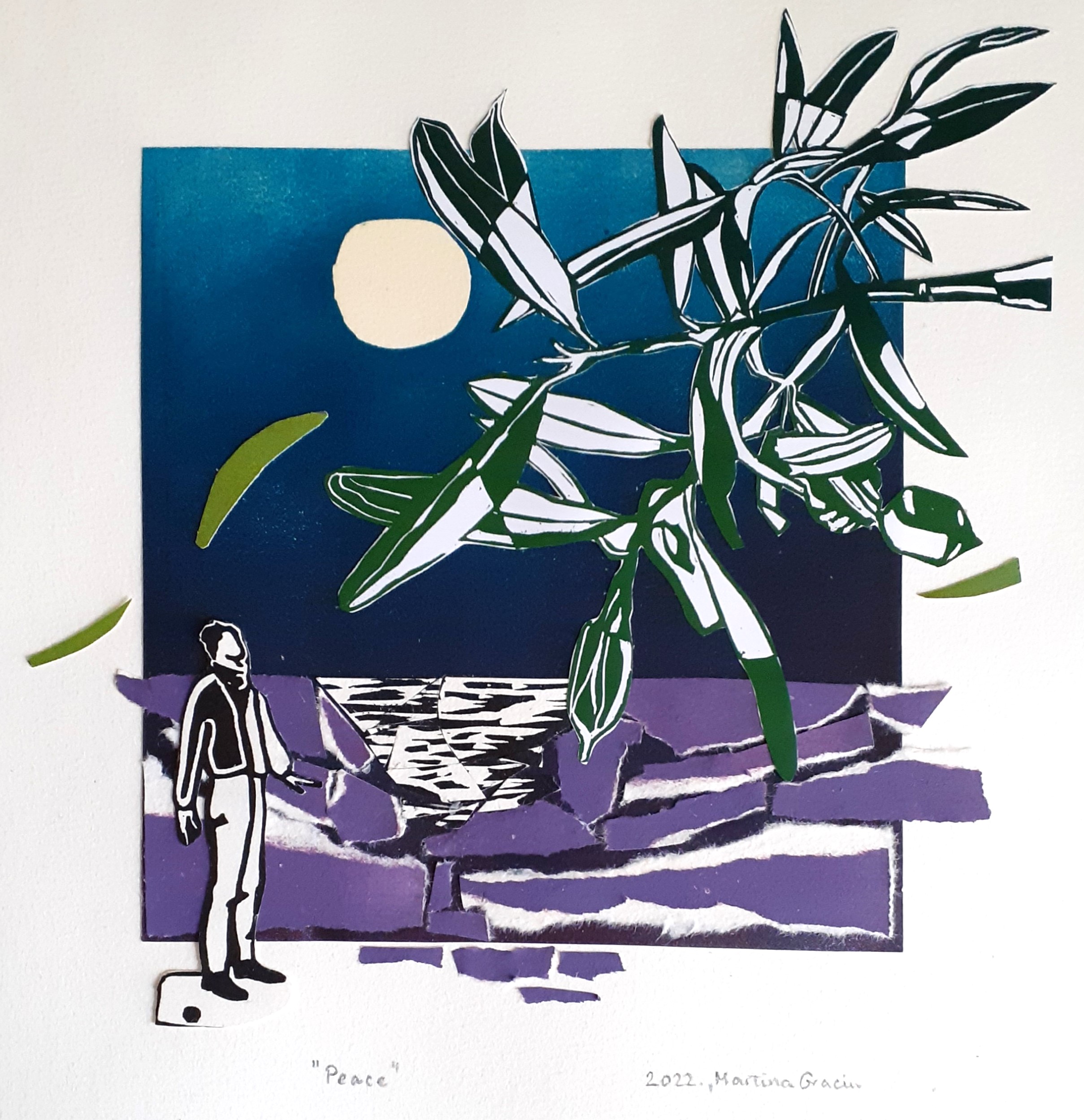 Sljedeća se dva rada ponovo vežu za dalmatinske noći. Nazvana Peace i Peace II, za glavni element imaju maslinovu granu. Lik na lijevom radu isti je kao i onaj na Wow! What a summer., dok je glavni lik na desnom radu učenjak koji čita za stolom. Oba su preuzeta s mog linoreza Stara sveučilišna.