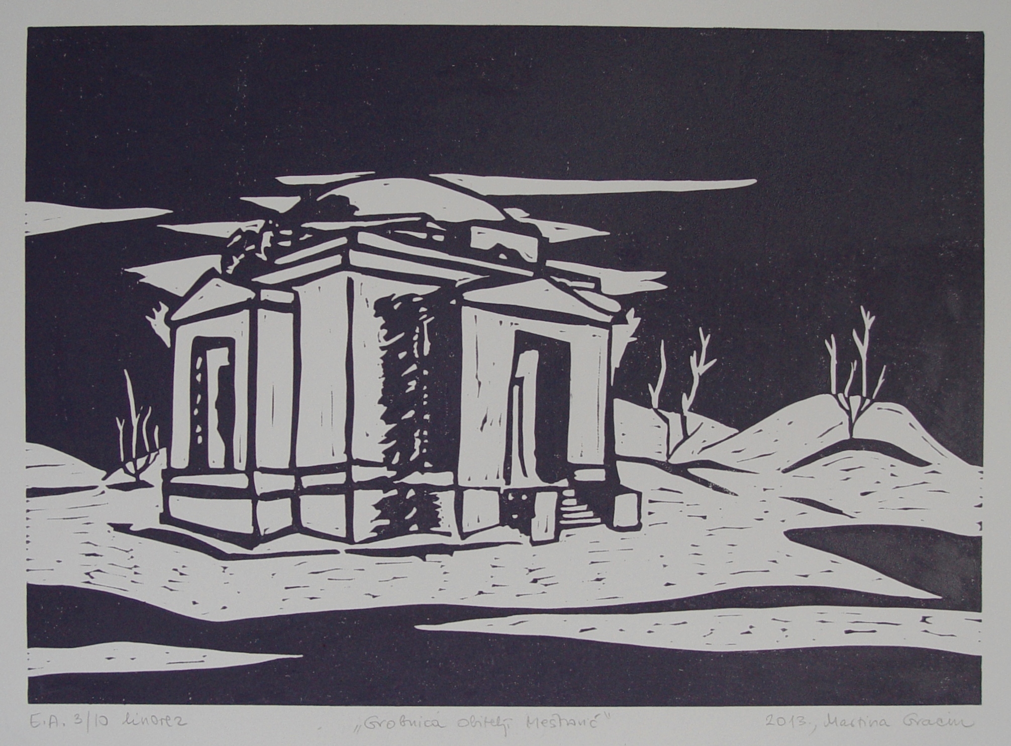 Radi se o Grobnici obitelji Meštović u Otavicama. Grobnicu smo posjetili jednog lijepog sunčanog dana kasnog ljeta, ali noćni motivi dalmatinskog bilja dali su mi ideju o prebacivanju scene u noćni prizor. I tako, crtajući, počela sam se pitati bi li rad sa slikarske kolonije mogao biti- linorez. Pitala sam glavnog i odgovornog, a on je pristao nakon manjeg pokušaja odgovaranja (Martina, ti bi radila linorez? Pa dok napraviš jedan linorez, već naslikaš tri slike…). To je bilo presudno, već sam vidjela nastavak noćnog Meštrovića.