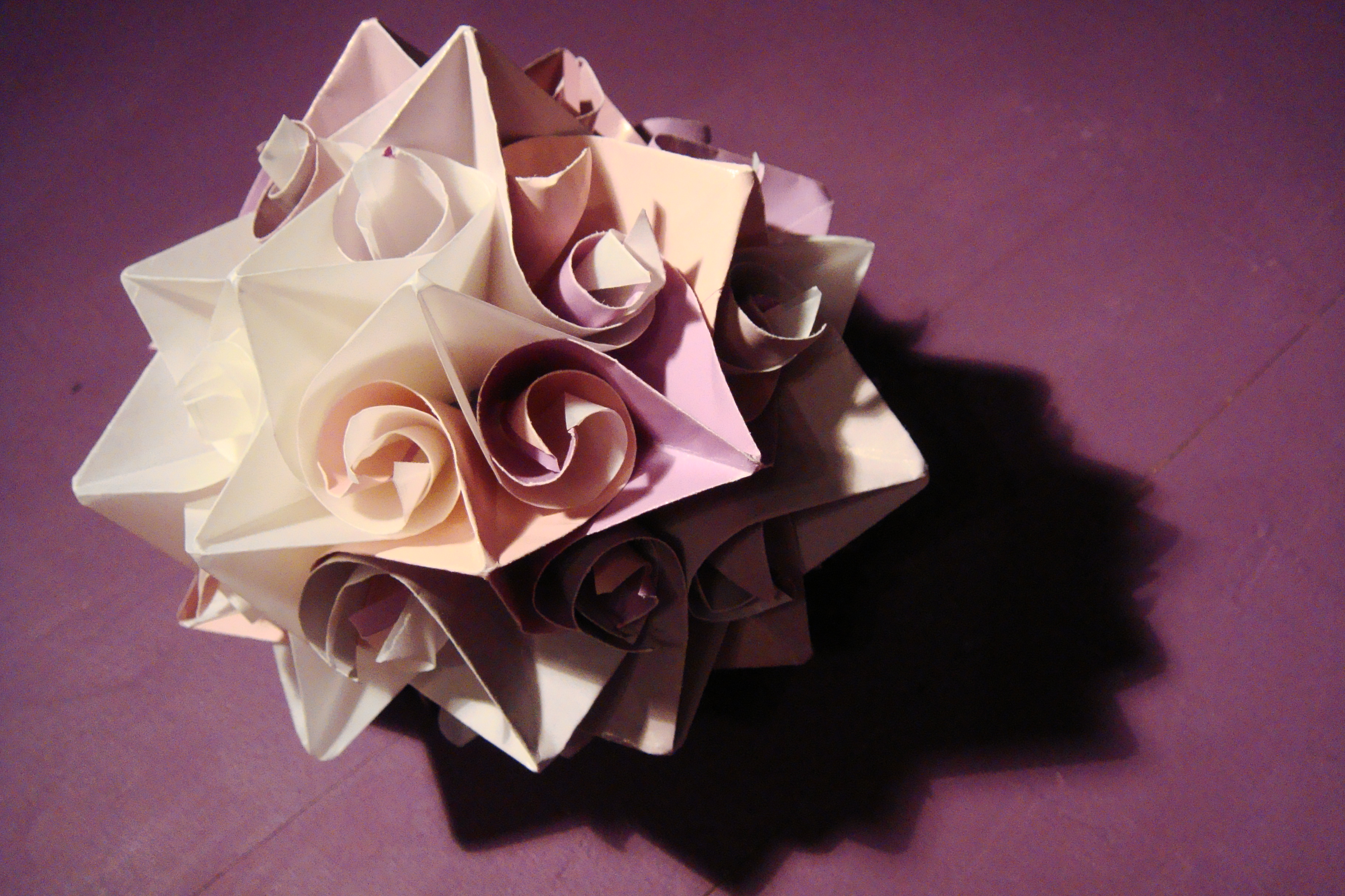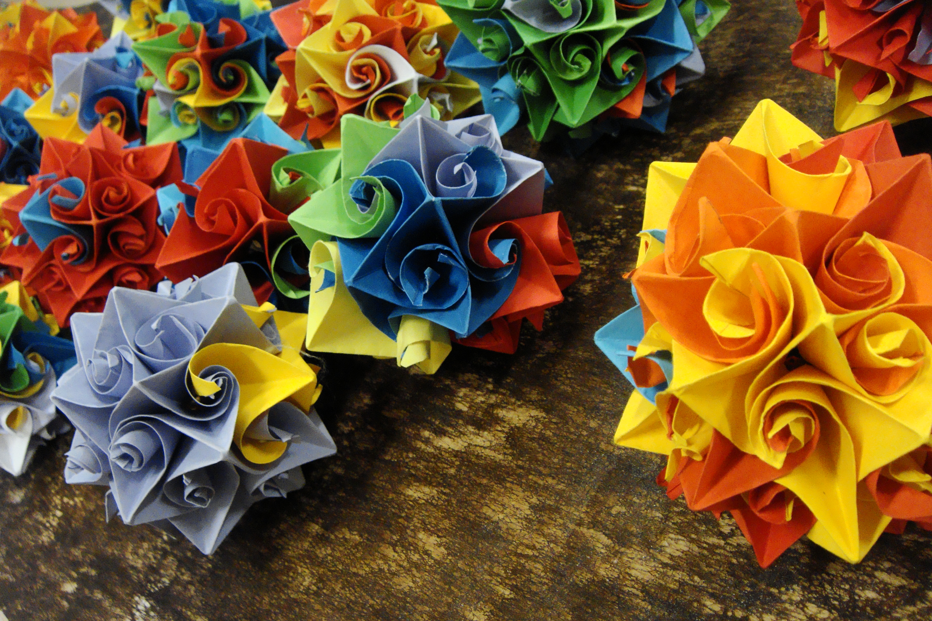 Sve je počelo kad sam vidjela Amadeinu origami zvijezdastu kuglu. Amadea ih je napravila u oooogromnim količinama dok je radila kao tajnica i imala viška slobodnog vremena. Eh kako neke priče hrane predrasude… Na sreću, znam svjetlijih primjera obima posla ljudi koji rade u uredu…Uglavnom, tu se rodila ideja za ovogodišnje ukrase za bor. Napravili smo i radionicu, no kako zvjezdastih kugli nije bilo dovoljno, imali smo i dodatnog posla za kući… Uskoro su kugle postale predmet eksperimenata i raznih varijacija.