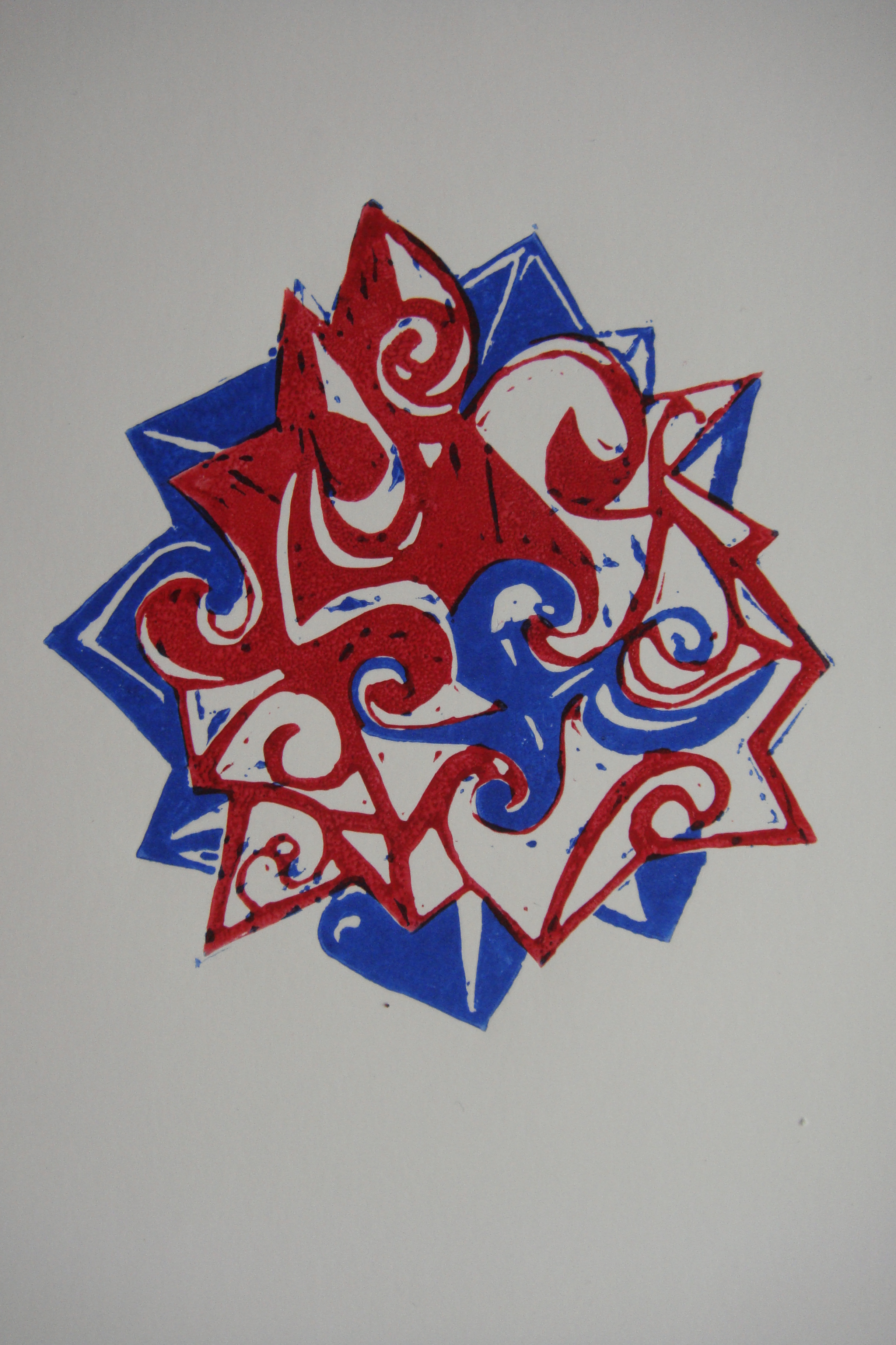 Eksperimenti su se proširili i na područje linoreza. Već dugo nisam radila ništa u više boja. Uz to, prvotni (brzo napušteni) plan bio je izrađivati zvjezdaste kugle u dvije boje.