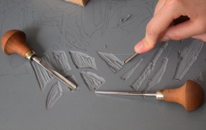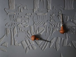 This linocut was supposed to be in colour. Since there were some areas of diluted Indian ink on the sketch as well, I first started with tone combinations.