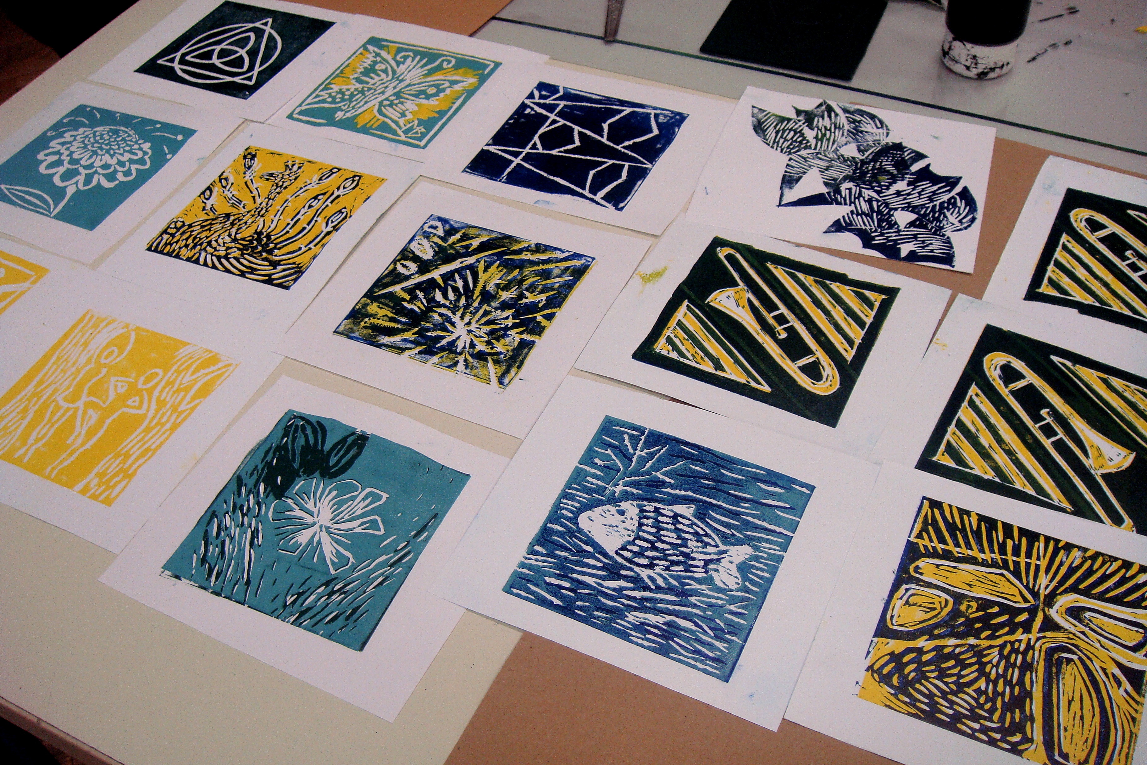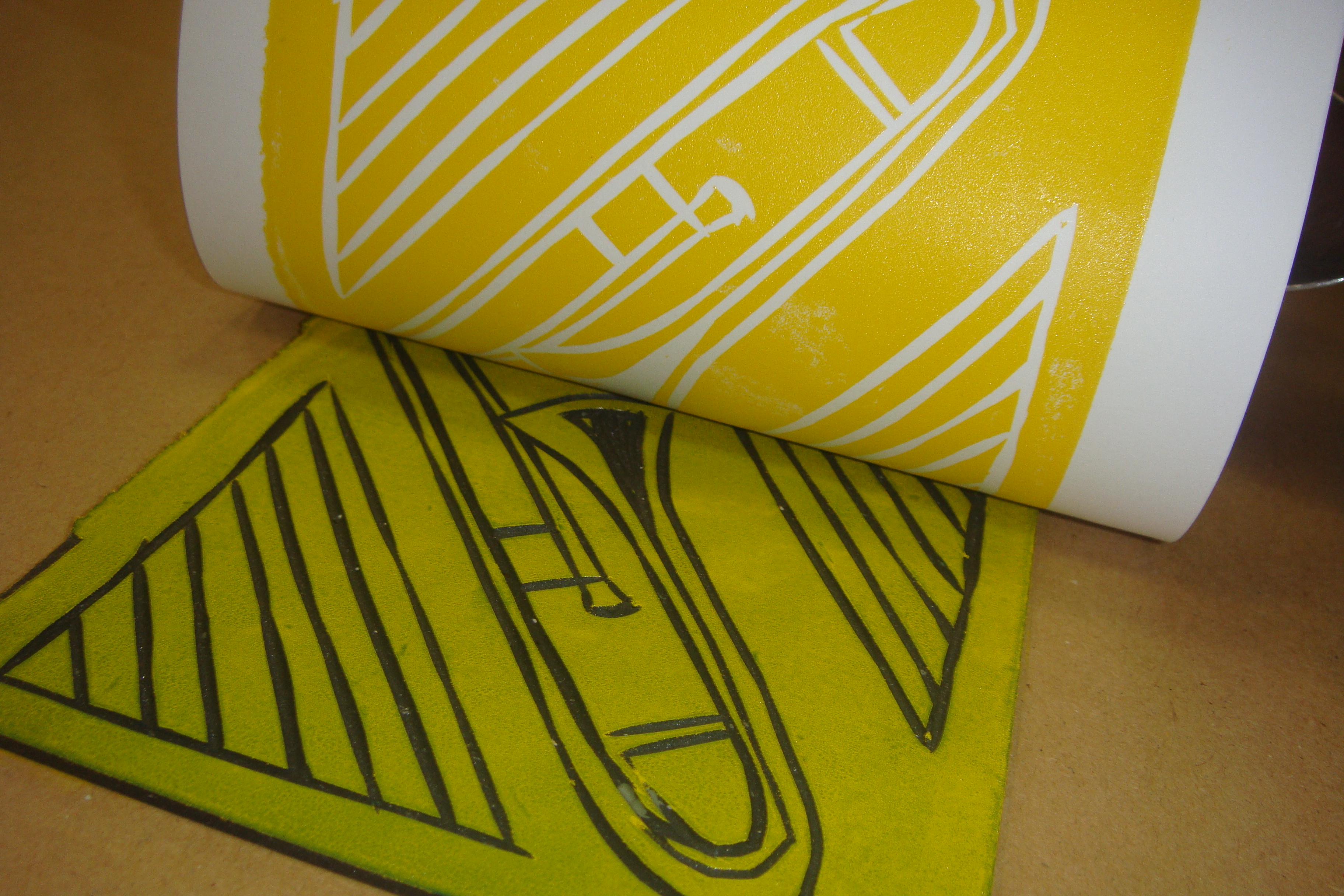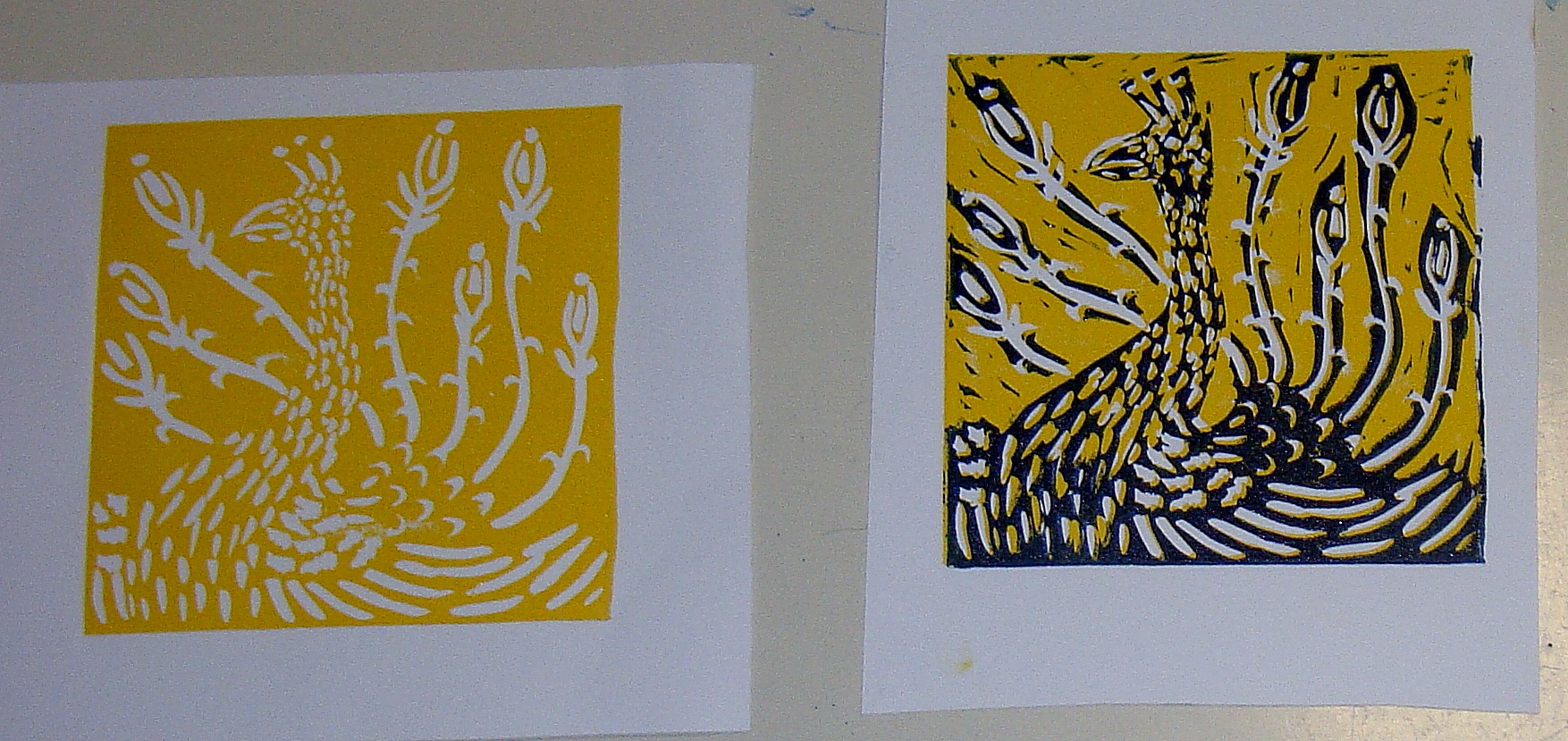 Druga mogućnost dobivanja višebojnosti je otiskivanje na unaprijed obojen papir. U ovom slučaju (zadnja fotografija gore), obojeni papiri su također napravljeni procesom otiskivanja boje sa ploče linoleuma.