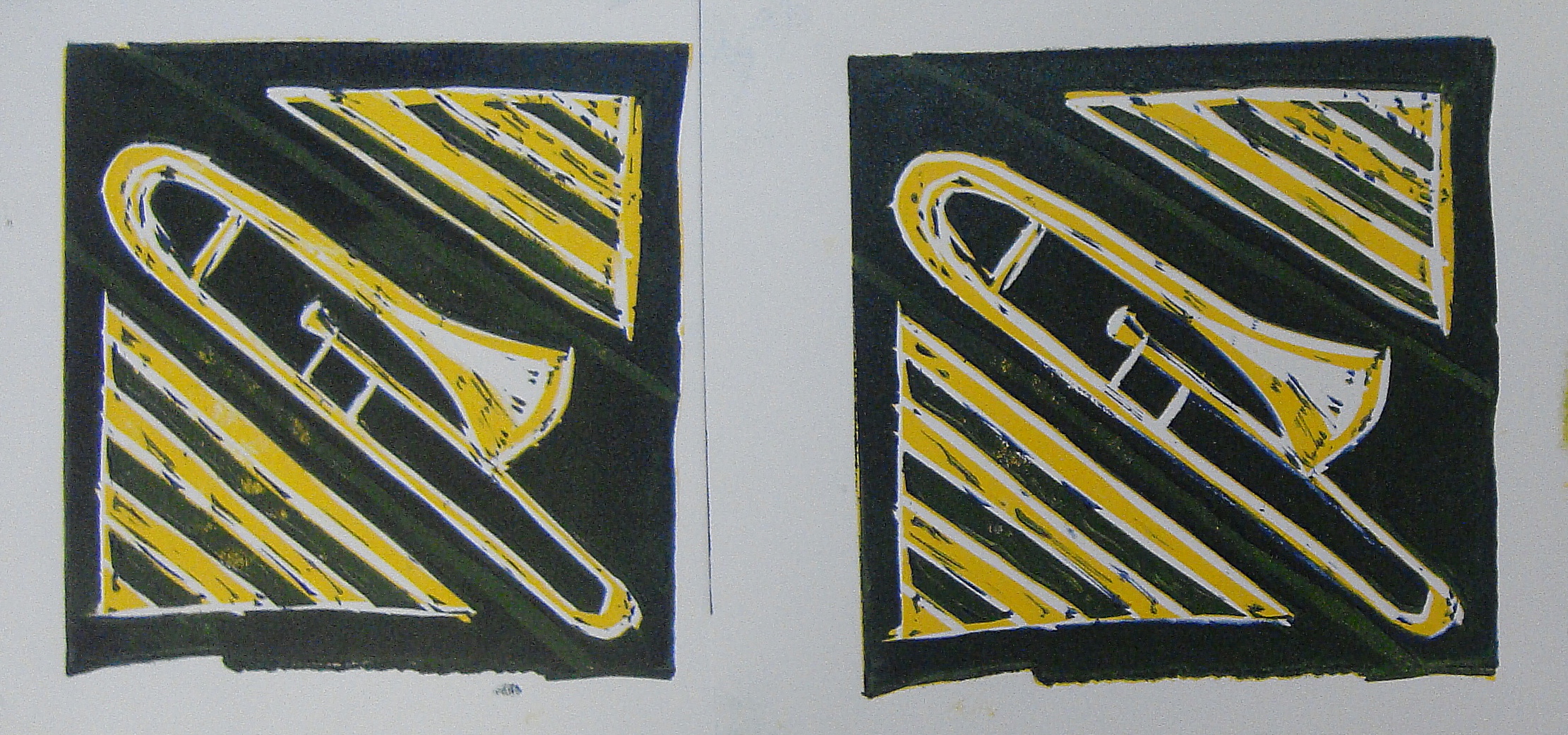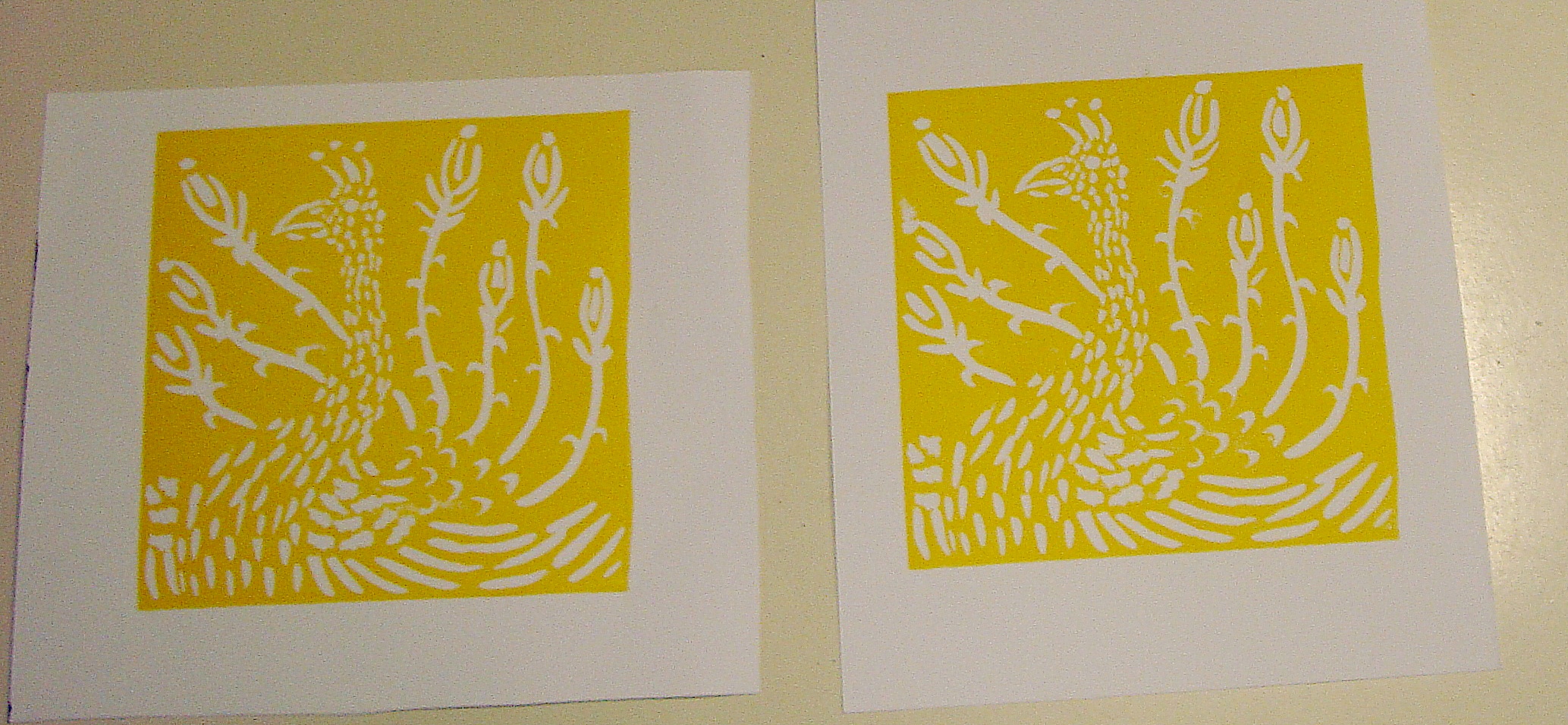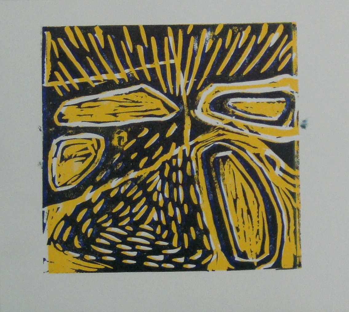 Druga mogućnost dobivanja višebojnosti je otiskivanje na unaprijed obojen papir. U ovom slučaju (zadnja fotografija gore), obojeni papiri su također napravljeni procesom otiskivanja boje sa ploče linoleuma.