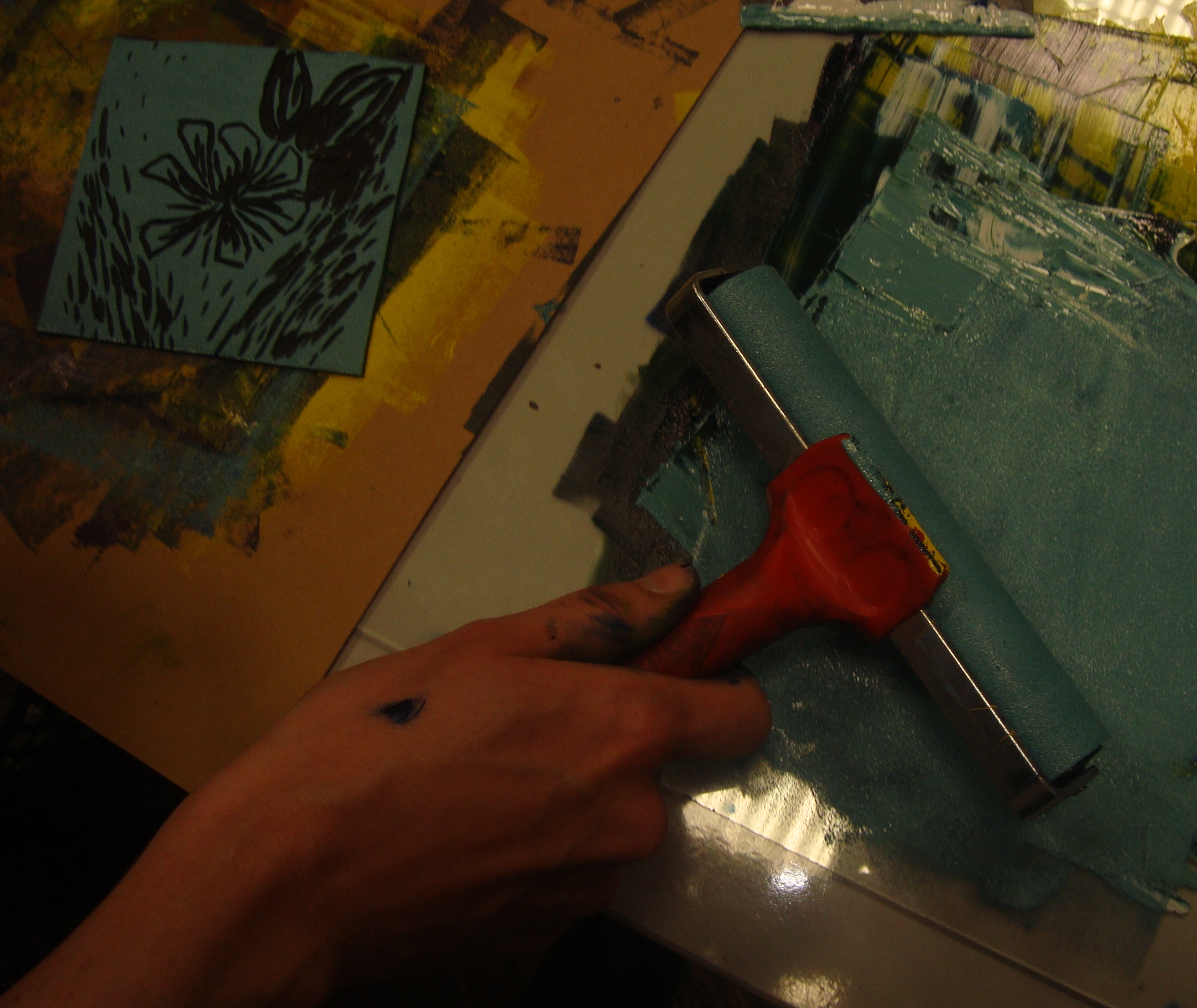 Nakon što se nanesu na staklenu površinu, boje treba razvaljati valjkom i nanijeti na ploču linoleuma.