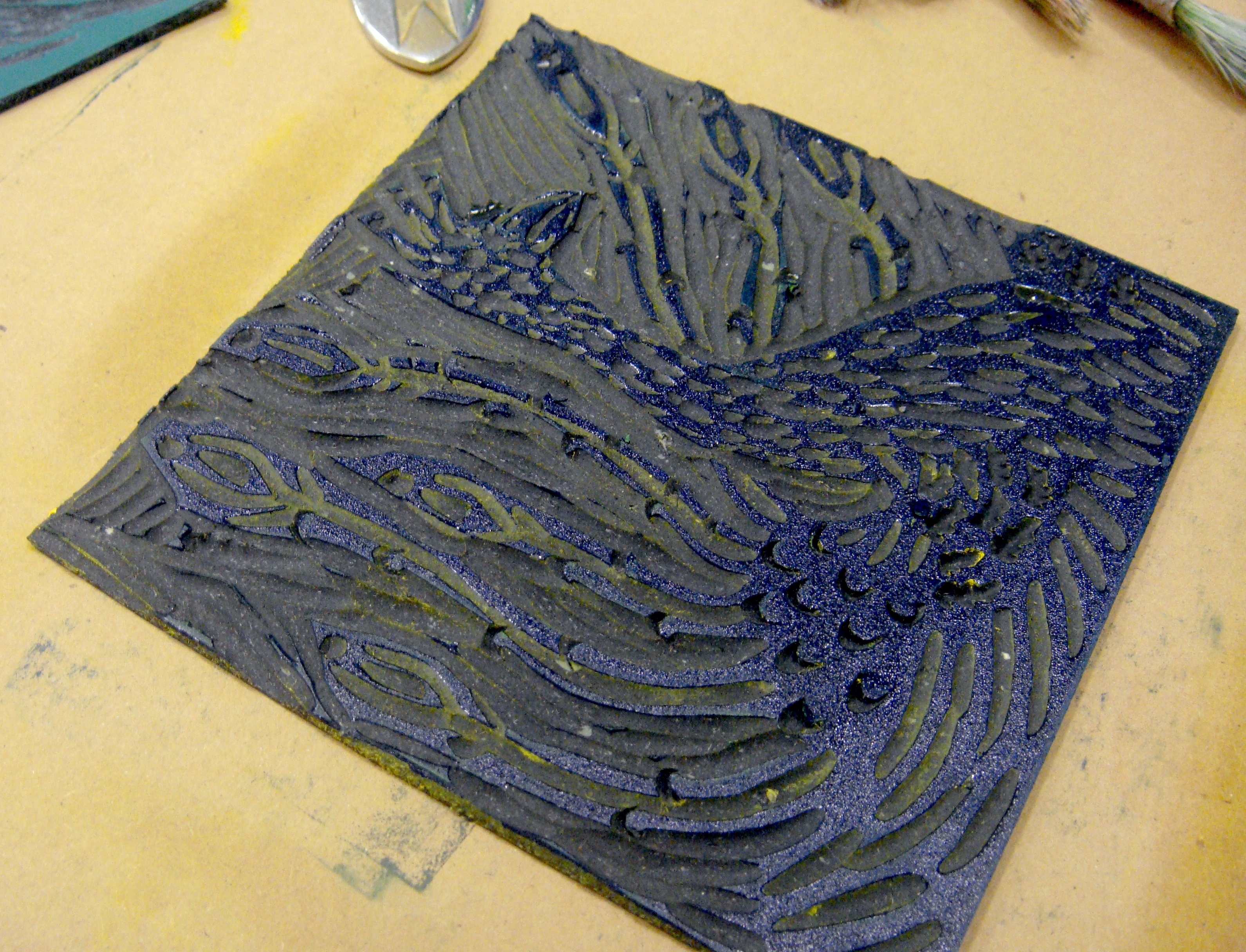 Još jedna ploča nakon otiskivanja. Na područjima gdje je otiskivan crtež više nema boje.