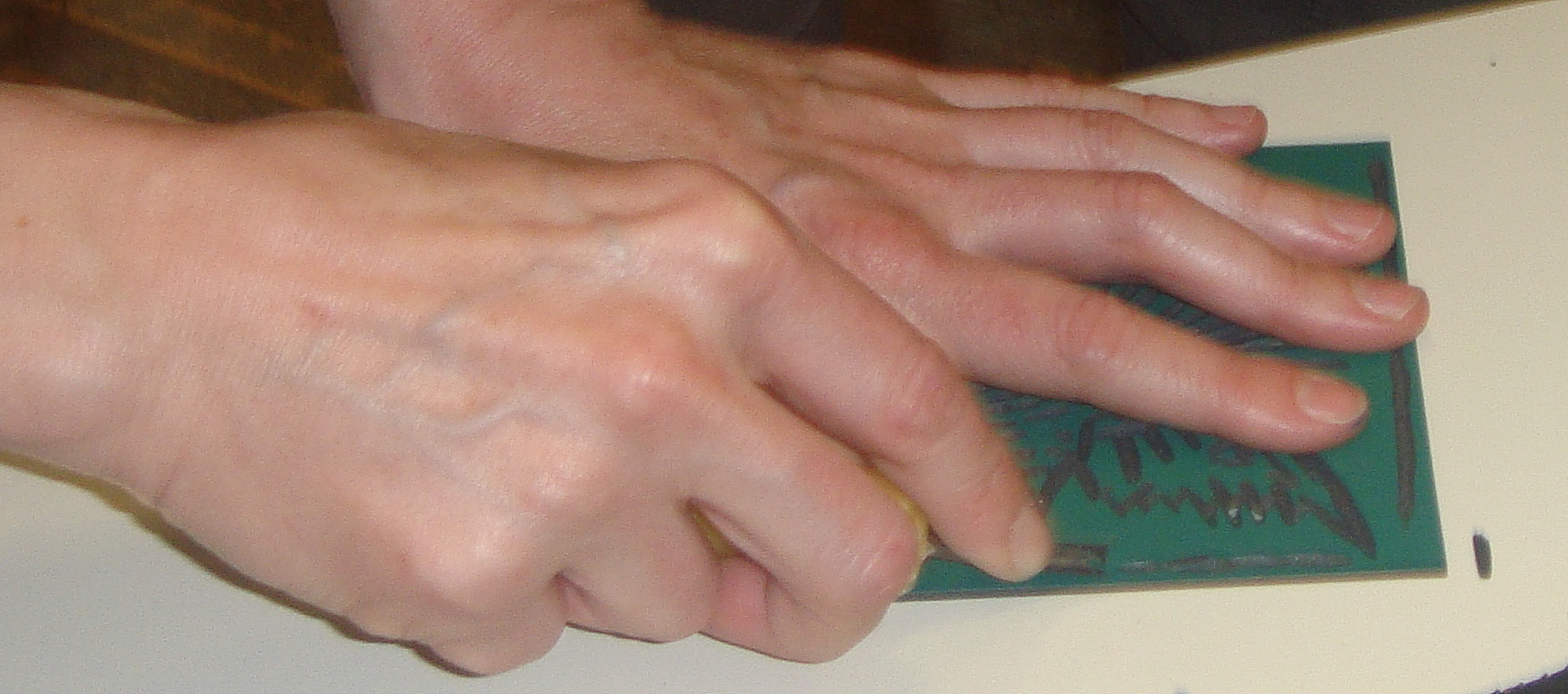 Još preostaje proces otiskivanja. Crtež položimo na pripremljenu ploču linoleuma i olovkom ga ponavljamo, odnosno podebljavamo. Prilikom podebljavanja crteža treba paziti da se rukom ne naslanjamo na ploču, kako bi nam se otisnuo samo crtež, a ne i ruka.